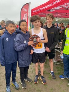 Caleb Singleton set off first with a solid run recording 15.22m before handing on to teammate Robert Stanciu who ran another improved race holding on to fourth place with 14.46m . Ever consistent runner Elias Furreedan was next up and despite also observing Ramadan he produced another gritty run of 14.17m before handing over to experienced teammate Luke Thake in fourth place. Luke typically ran a really strong last leg producing the fastest time of 14.12m and holding on to 4th frustratingly missing out on the medals.