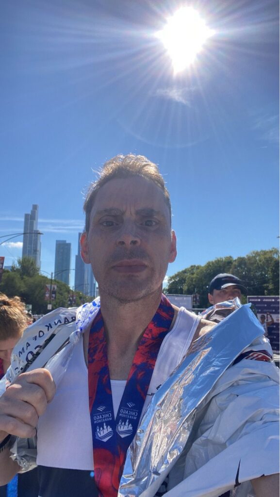 Chris reached halfway in 1 hr 29mins 56 secs and ran almost the same time for the second half, crossing the finish line in 3 hours and 30 seconds placing 4,158th